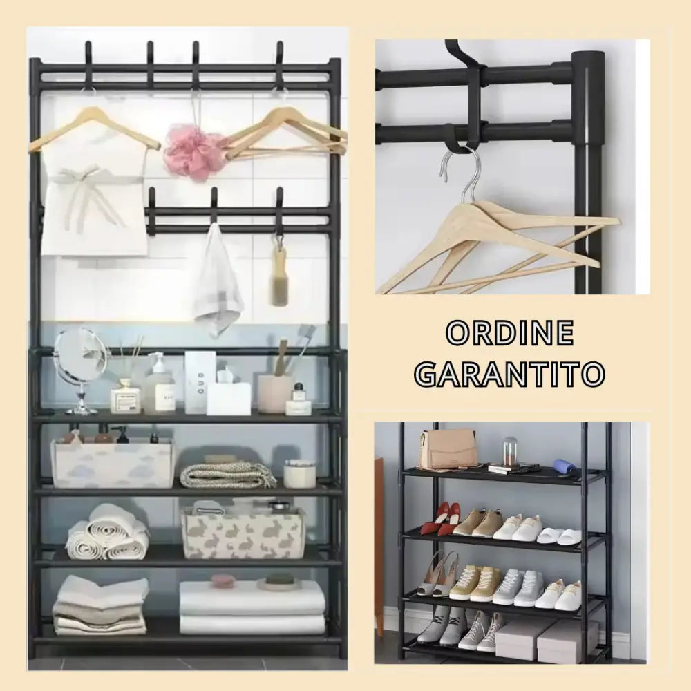 Mobile Salvaspazio con Mensole e Ganci Appendiabiti e Organizzatore per Scarpe in Tessuto | Soluzione Pratica per la Casa e la Camera da Letto